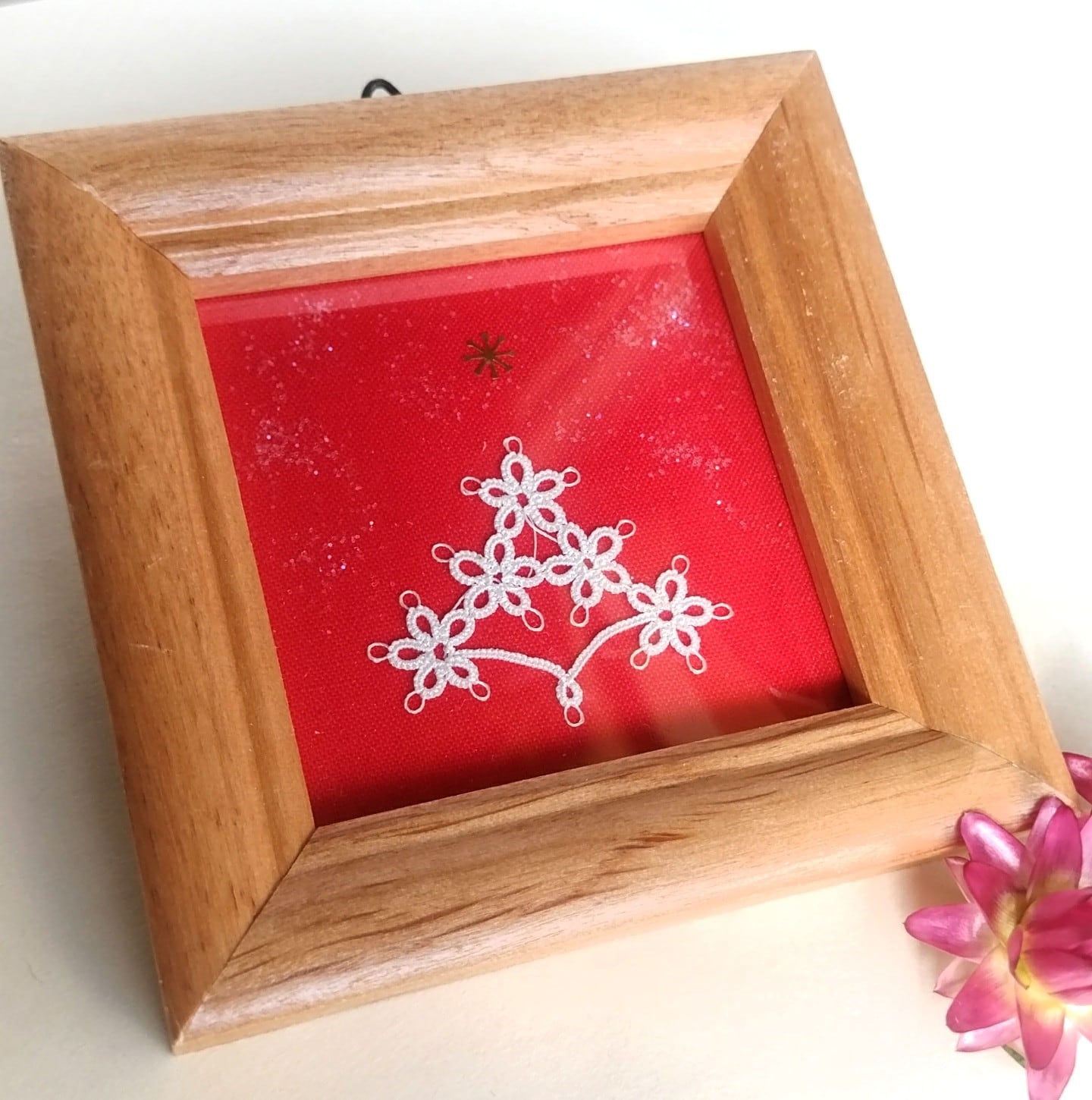 極細のシルクタッチの糸でタティングレースのクリスマスツリーを編みました。