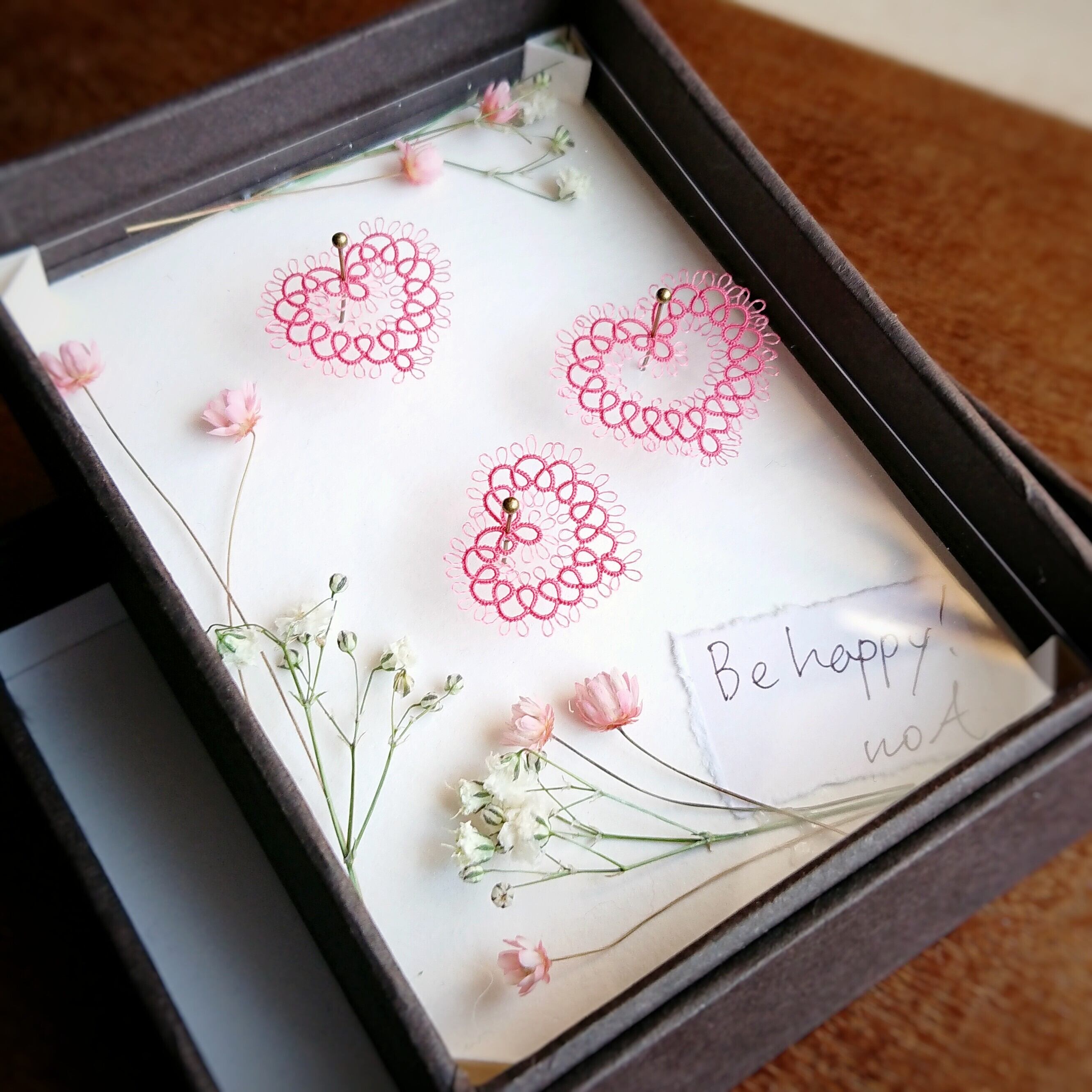 ミニチュアのハートのタティングレースを標本のように、箱に入れています。