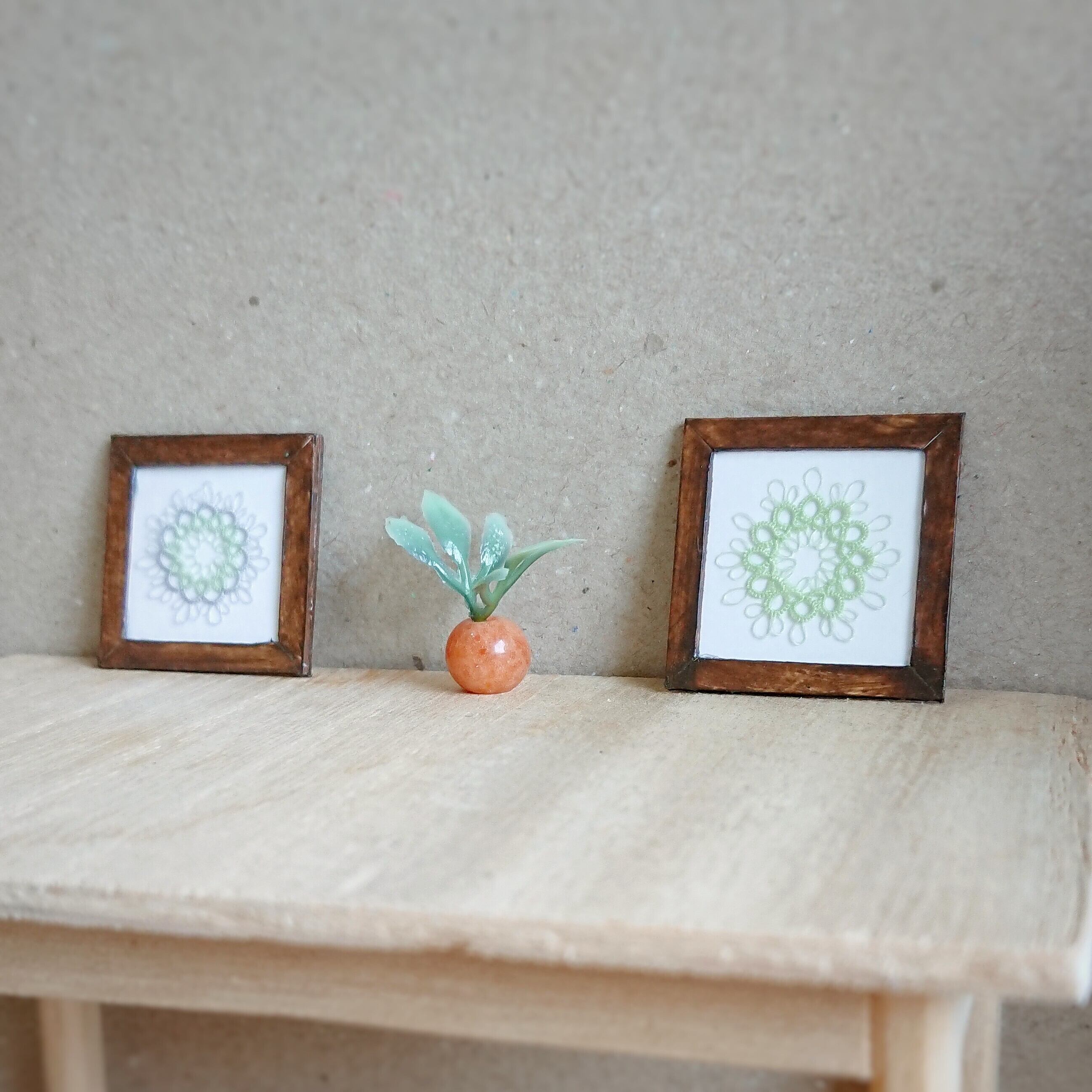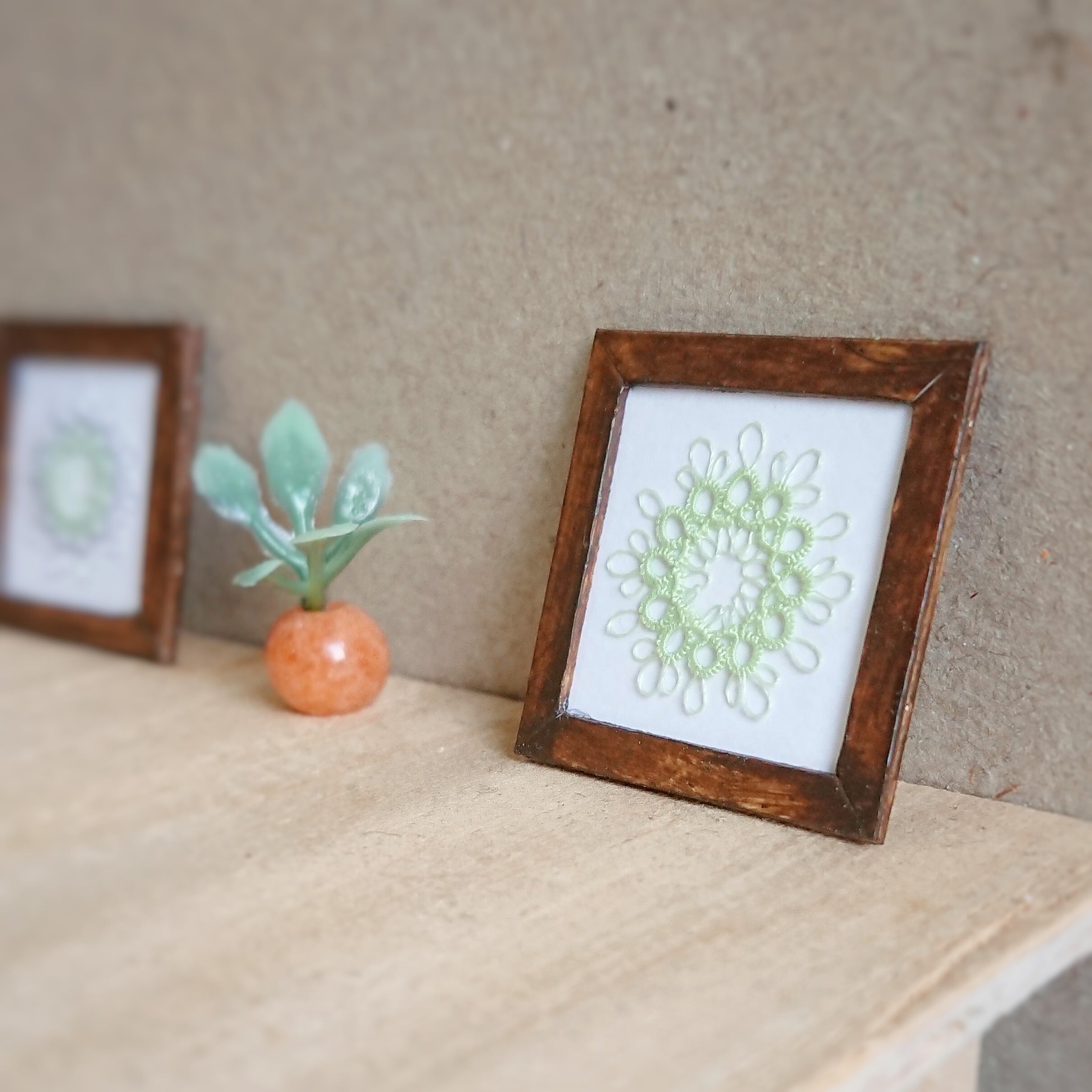 ドールハウス用のミニ額縁です。手編みのタティングレースのミニチュアを額装にしました。