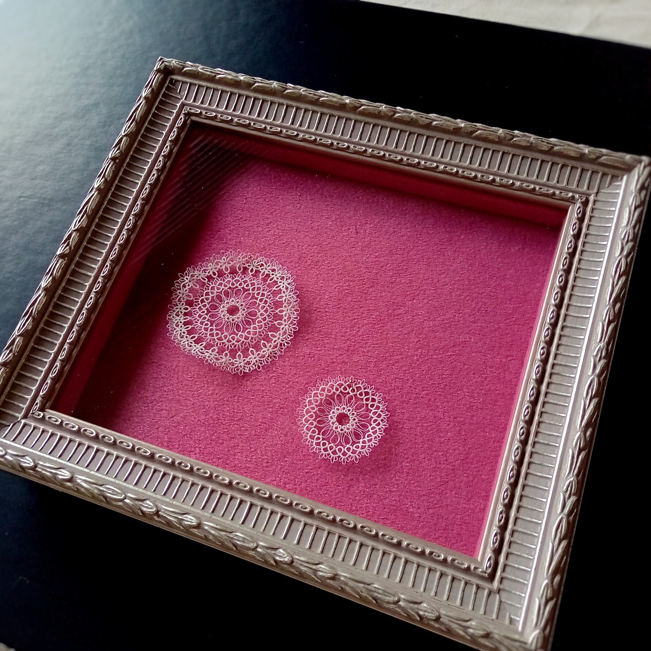極細糸で手編みした、オリジナルレシピのタティングレースの額装作品です。